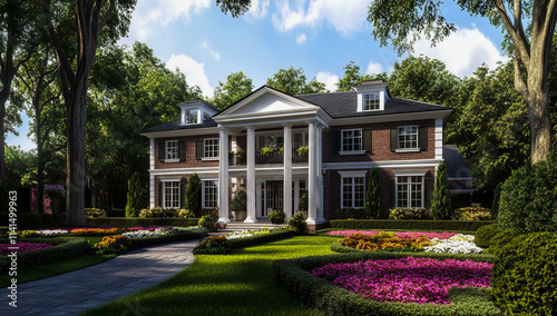 A charming colonial-style house with symmetrical windows, white pillars at the front entrance and a well-maintained exterior with traditional architectural elements.