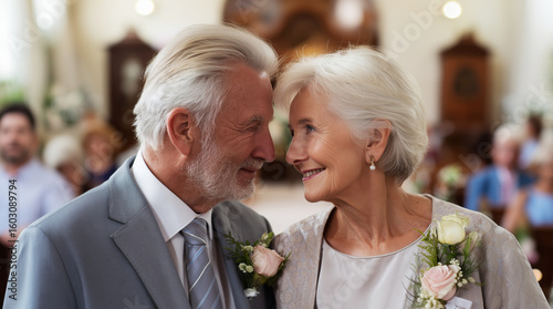 A charming elderly couple gazes lovingly at each other during their wedding ceremony.