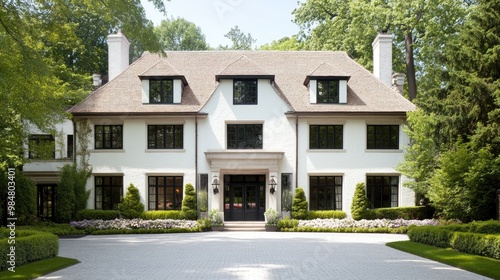 A charming farmhouse showcases its traditional architecture with black windows and a grand front door, complemented by lush green hedges in the background