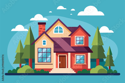 A charming flat illustration features a cozy house surrounded by vibrant trees under a blue sky with clouds, Choose a customizable flat illustration of a house.