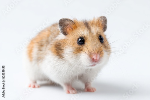 A charming golden hamster with bright eyes stands alert, showcasing its soft fur and adorable features against a clean background.