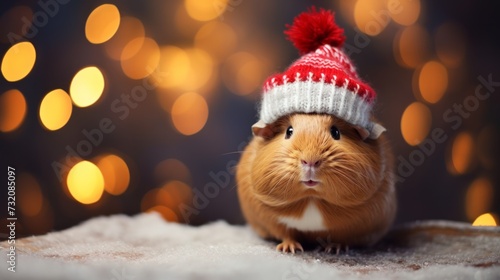 A charming guinea pig dons a knitted hat against a Christmas backdrop.