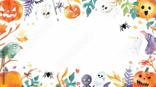 A charming Halloween watercolor frame designed for kids, featuring a playful border with cute Halloween icons such as smiling skeletons, friendly ghosts, and cheerful spiders. The watercolor style