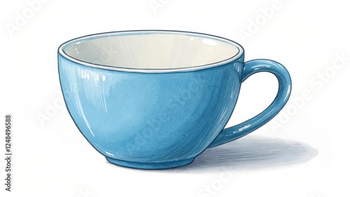 A charming illustration of a single, empty, light blue teacup with a slightly curved handle