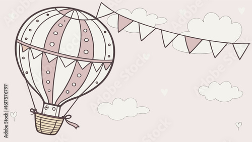 A charming illustration of a vintage air balloon floating in the sky with clouds, perfect for baby shower invitations and romantic designs