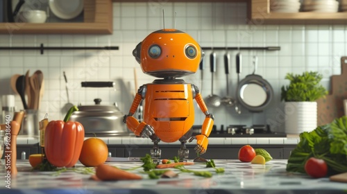 A charming orange robot stands in a modern kitchen, surrounded by fresh vegetables, ready to cook. The scene is vibrant with the contrast of metallic and organic elements, reflecting a futuristic yet