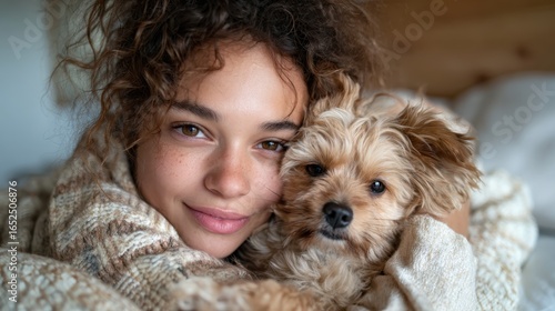 A charming portrait of a girl embracing a small puppy, radiating warmth and affection, captured with soft lighting for an inviting, cozy atmosphere.