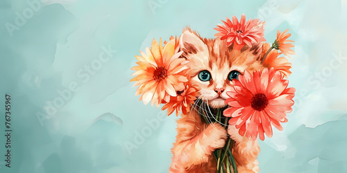A charming red kitten holds a bouquet of red gerberas on a blue background,a place for text,a watercolor illustration, a concept for advertising pet products, greeting cards and festive design