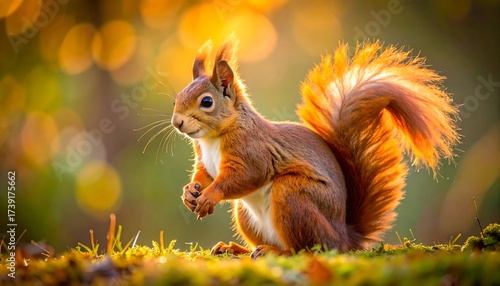 A charming red squirrel, bathed in golden sunlight, perches alertly on a bed of moss and grass, its fluffy tail highlighted against a bokeh background