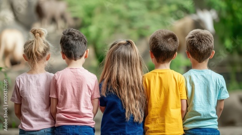 A charming scene featuring four children observing animals, showcasing wonder and curiosity in a vibrant outdoor setting.
