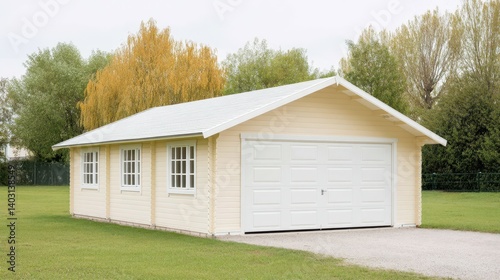 A charming single-story garage with a white exterior, surrounded by lush greenery. Designed for functionality, this structure blends seamlessly into its serene environment.