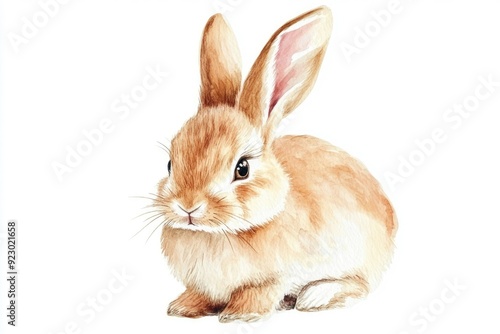 A charming, small bunny with soft fur sits calmly, the warm colors of its coat beautifully contrasted against a pristine white background