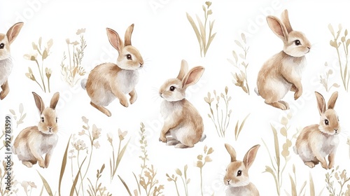 A charming watercolor pattern featuring playful rabbits surrounded by delicate flowers, perfect for spring-themed designs.