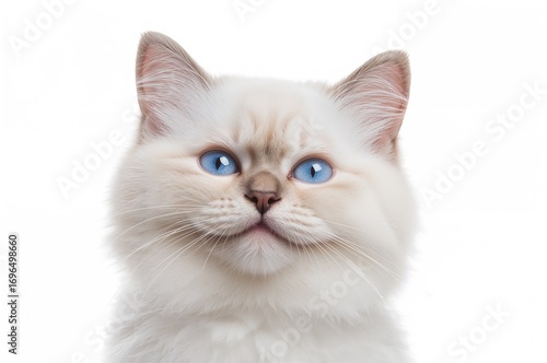 A charming white feline with striking blue eyes and a joyful expression fills the photo, set on a plain white backdrop.