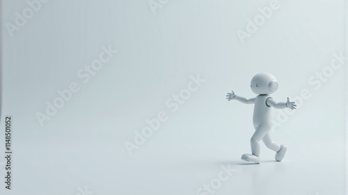 A charming white figure joyfully walks in a bright, minimalistic environment, showcasing simplicity.