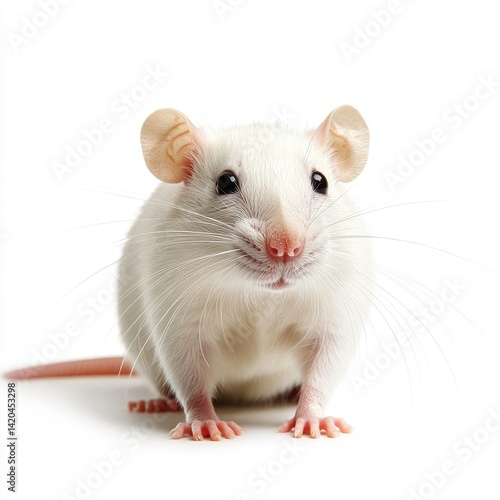A charming white rat with pink nose and ears standing on a white surface looking at the camera directly
