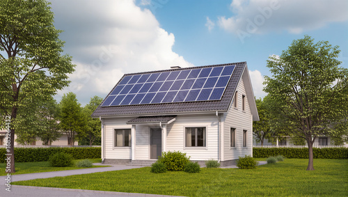 A charming white suburban house with a gabled roof covered in solar panels. The house is surrounded by a well-kept green lawn and trees under a bright blue sky.