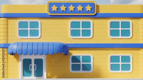 A charming yellow cartoon building with a blue awning, displaying a five-star rating.