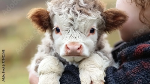 A charming young calf with curly fur and big eyes is being held by a person, highlighting a bond between humans and farm animals in a natural outdoor setting.