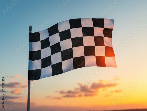 A checkered flag waving against a vibrant sunset sky, symbolizing victory and racing.