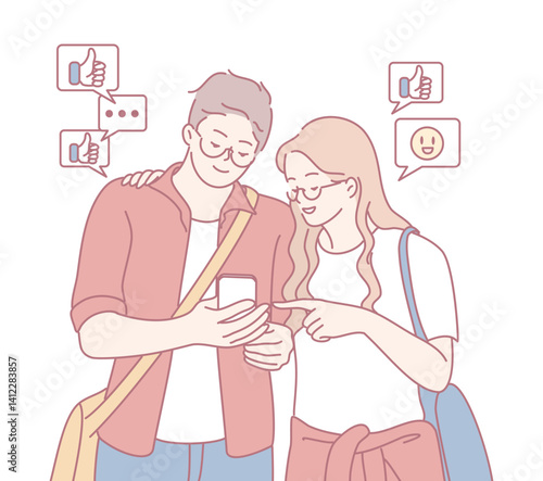 A cheerful and playful couple are joyfully using a smartphone together, enjoying social media engagement and connection