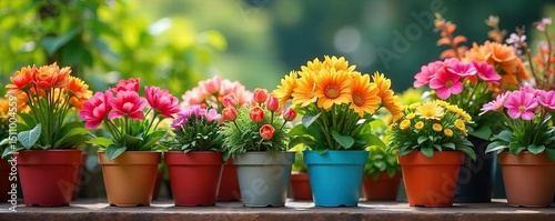 A cheerful arrangement of colorful potted plants overflowing with vibrant blooms, creating a lush and happy atmosphere , balcony garden, flowers, plant arrangement