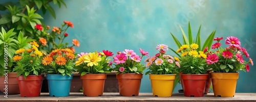 A cheerful arrangement of colorful potted plants overflowing with vibrant blooms, creating a lush and happy atmosphere , plant arrangement, bright