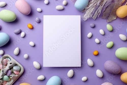 A cheerful arrangement of pastel Easter eggs and candies, artfully scattered around a blank card, creating a vibrant, festive atmosphere of spring.