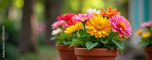A cheerful array of colorful flowers blooming in a terracotta pot, ready to brighten any space Perfect for spring, summer, or home decor themes , bright, planting, sunlight