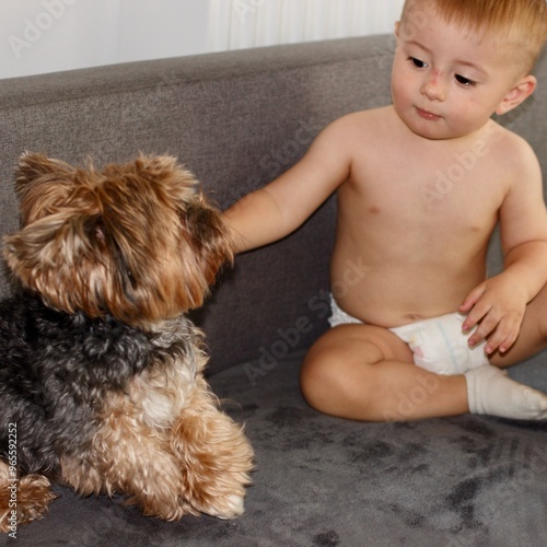 A cheerful baby is playing nicely with a pet Yorkie dog in the room