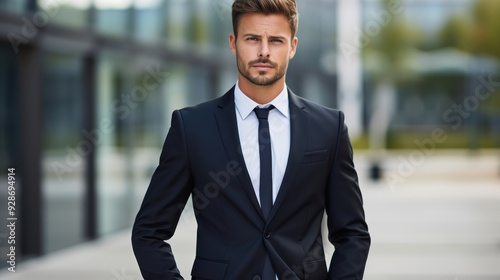 A cheerful businessman in a formal suit smiling confidently at the camera,