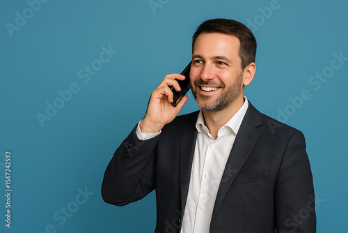A cheerful businessman in a white shirt and dark suit jacket happily talking on his smartphone, smiling broadly against a vibrant blue background