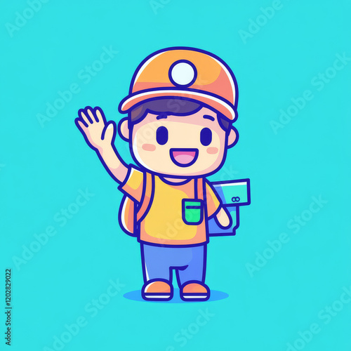 A cheerful cartoon boy in a yellow shirt and cap waves while holding a letter, set against a bright turquoise background.