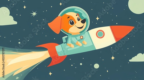 A cheerful cartoon dog in a spacesuit joyfully rides a rocket through outer space.