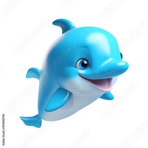 A cheerful cartoon dolphin with a big smile, leaping through the air.