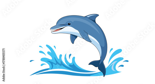 A cheerful cartoon dolphin with a friendly smile and winking eye leaps gracefully from the vibrant blue ocean waves, creating playful splashes.