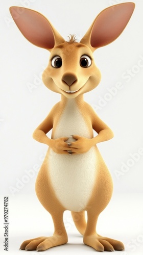 A cheerful cartoon kangaroo character standing with hands clasped, exuding friendliness.