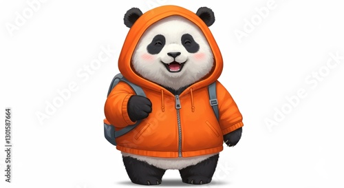 A cheerful cartoon panda wearing an orange hooded jacket and a backpack stands laughing
