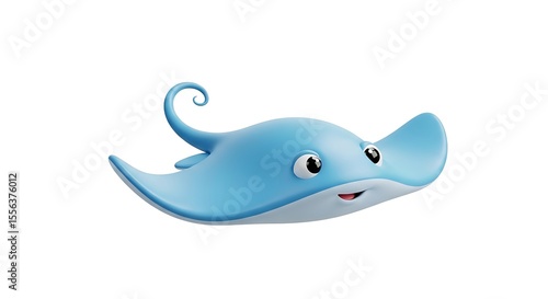 A cheerful, cartoon stingray swims playfully against a white background.