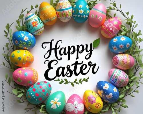 A cheerful, cartoonish chick holding a white egg, nestled in a nest with colorful Easter eggs.