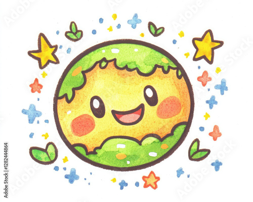A cheerful, cartoonish planet with a smiling face, surrounded by colorful stars and leaves, representing happiness and nature.