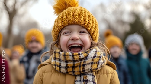 A cheerful child laughing while wearing a yellow beanie and scarf.