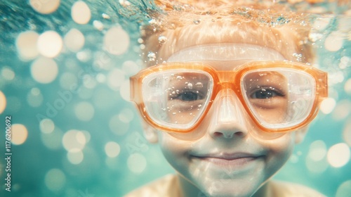 A cheerful child with orange goggles enjoys the underwater experience, surrounded by shimmering bubbles and light reflections