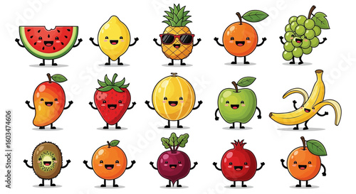 A cheerful collection of cartoon fruits with smiling faces, arms raised, including watermelon, lemon, pineapple, orange, grapes, mango, strawberry, melon, ap...