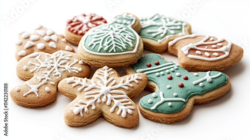 A cheerful collection of holiday cookies shaped like ornaments, snowflakes, and mittens, adorned with vibrant sugar decor, isolated on white