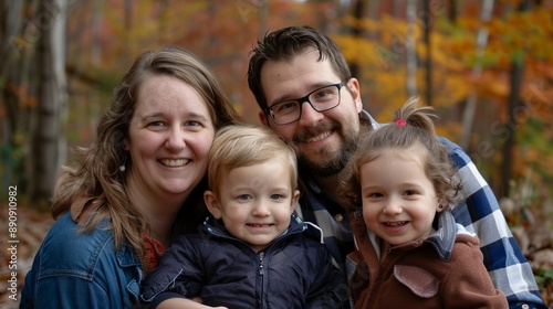 A cheerful family of four, comprising parents and two young children, smiles together outdoors, with autumn leaves in the background, illustrating joy and togetherness in nature.