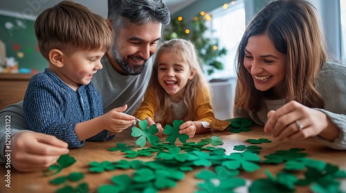A cheerful family with children crafting St. Patrick's Day decorations together, cutting green paper clovers for a festive garland. A moment of creativity, bonding, and holiday joy.