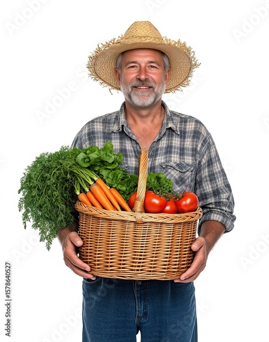 A cheerful farmer with straw hat carries a wicker basket full of fresh carrots, tomatoes, and leafy greens harvest.