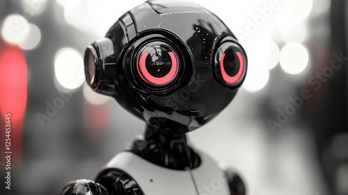 A cheerful, futuristic droid support worker with a playful black-and-white design, set against a soft blur background with vibrant lighting. Perfect for tech and AI-themed projects