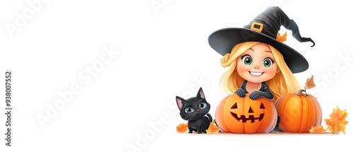 A cheerful girl in a witch hat, surrounded by pumpkins and a black cat, perfect for Halloween-themed designs and celebrations.